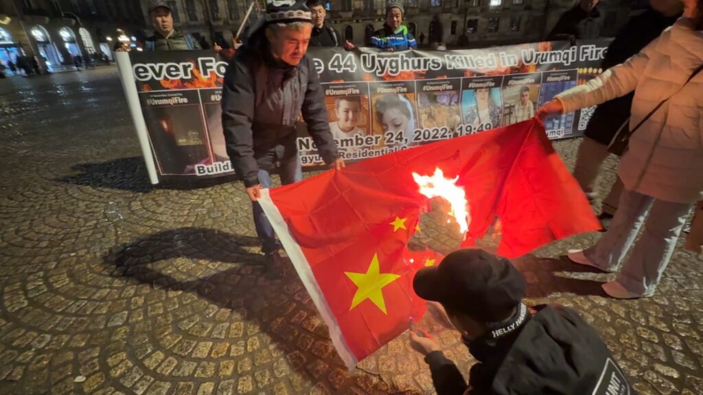 ئۈرۈمچى ئوت ئاپىتىنىڭ ئۈچۈنجى يىللىقىدا ئامىستېردامدا خىتاي بايرىقى ۋە شى جىنپىڭنىڭ سۈرىتى كۆيدۈرۈلدى